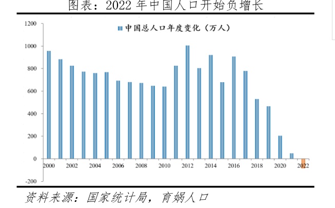 与此同时,在全面二孩政策不及预期、三孩政策效果尚未显现等因素影响下,2022年中国总人口开始负增长,是1949年以来除三年自然灾害期外,第一次负增长。具体来看,从2017年开始,我国出生人口便开始连续下降,2022年出生人口956万人,比2021年减少106万人,创历史新低,开始出现负增长。