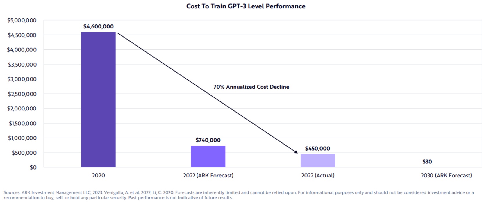 ARK相信,这些技术可以共同为全球经济的未来提供指数级增长。该公司预测,人工智能培训成本将继续以每年70%的速度下降。ARK指出,从这个角度来看,将一个大型语言模型训练到GPT-3水平的成本在2020年接近460万美元,到2022年降至45万美元。
