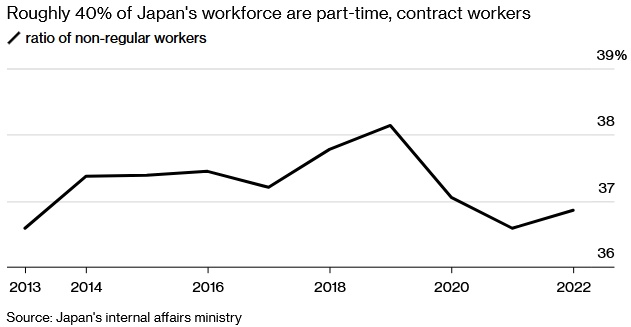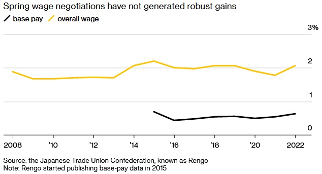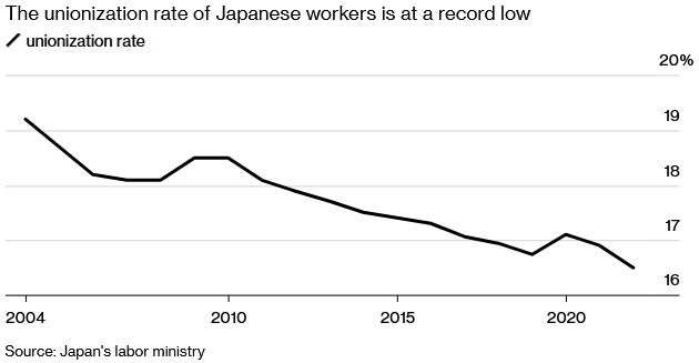 尽管有春季工资谈判,但谈判结果对许多员工来说并没有太大意义。虽然在员工人数超过1000人的公司中,加入工会的员工比例接近40%,但整体的日本员工加入工会的员工比例仅为16.5%,创下新低。此外,日本约76%的劳动力受雇于员工人数不足1000人的公司。春季工资谈判的结果只反映了少数人的工资水平。