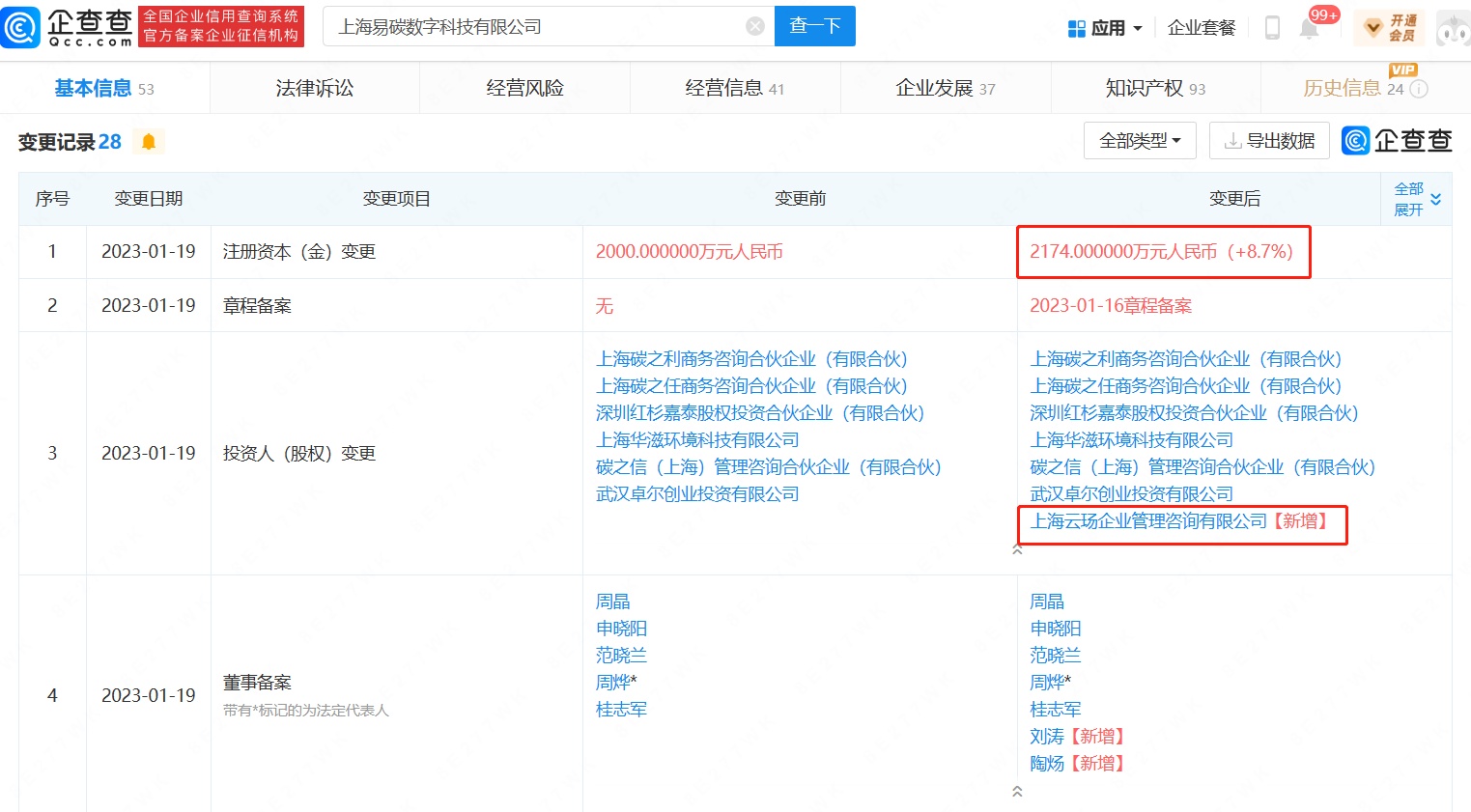 智通财经APP获悉,企查查APP显示,近日,上海易碳数字科技有限公司(下称:易碳数科)发生工商变更,股东新增上海云玚企业管理咨询有限公司;注册资本由2000万人民币增至2174万人民币,增幅8.7%;董事新增陶炀、刘涛。股东信息显示,上海云玚企业管理咨询有限公司为蚂蚁科技集团股份有限公司全资子公司。