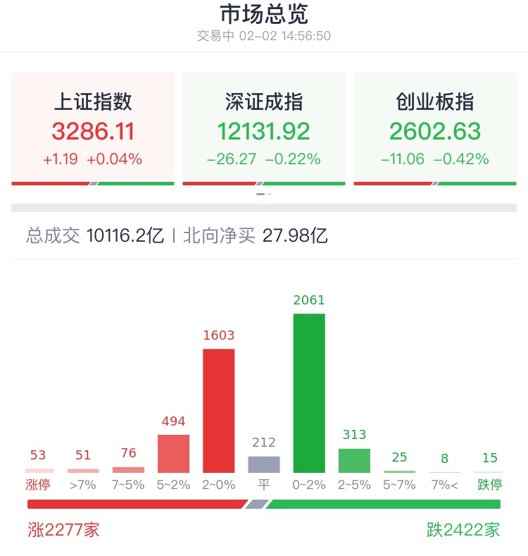 今日A股全天震荡回落,三大指数涨跌不一,科创50表现强劲。截至收盘,沪指涨0.02%,报3285.67点;深成指跌0.22%,报12131.20点;创业板指跌0.44%,报2602.32点;科创50涨0.51%。
