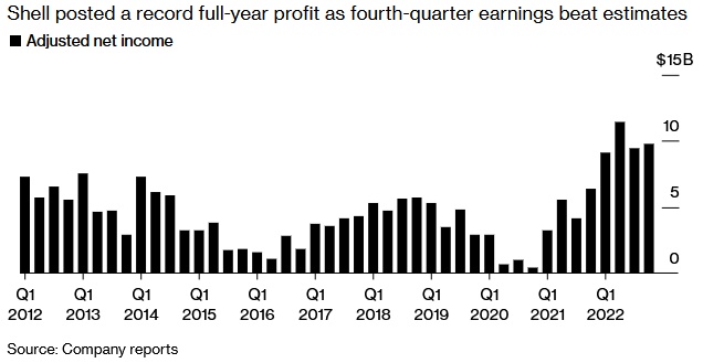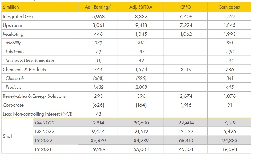 智通财经APP获悉,2月2日,壳牌(SHEL.US)公布了2022年第四季度及全年财务业绩。得益于天然气业务的蓬勃发展,壳牌第四季度的利润远超预期。在能源价格飙升的推动下,壳牌的全年利润更是创下新高。财报显示,壳牌Q4总营收为1011.95亿美元,同比增长12%;经调整的净利润为98.14亿美元,远超分析师普遍预期的79.7亿美元,同比增长54%;经调整的每股收益为1.39美元,上年同期为0.83美元;经调整的息税折旧摊销前利润(EBITDA)为206.00亿美元,同比增长26%。