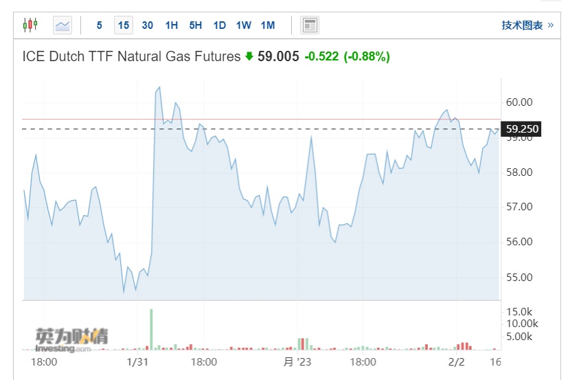 智通财经APP获悉,由于市场预期欧洲天然气库存充足、德州自由港液化天然气终端获得了重启的进一步批准,该地区的天然气期货价格出现下跌。截至发稿,荷兰TTF天然气近月期货下跌0.88%,报59.005欧元/兆瓦时。