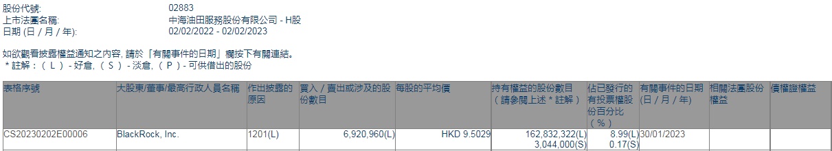 智通财经APP获悉,香港联交所最新资料显示,1月30日,贝莱德减持中海油田服务(02883)692.096万股,每股作价9.5029港元,总金额约为6576.92万港元。减持后最新持股数目约为1.63亿股,最新持股比例为8.99%。