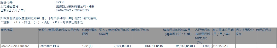PLC减持潍柴动力(02338)210.4万股,每股作价11.8515港元,总金额约为2493.56万港元。减持后最新持股数目约为9514.89万股,最新持股比例为4.9%。