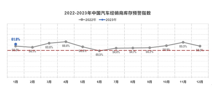 智通财经APP获悉,2023年2月1日,中国汽车流通协会发布的最新一期“中国汽车经销商库存预警指数调查”VIA(Vehicle Inventory Alert Index)。数据显示,2023年1月中国汽车经销商库存预警指数为61.8%,同比上升3.5个百分点,环比上升3.6个百分点,库存预警指数位于荣枯线之上,汽车流通行业处在不景气区间。经销商1月销售节奏受到干扰,预计1月汽车市场整体平稳,乘用车终端销量在140万辆左右。