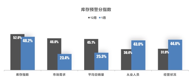 从分指数情况看:调查显示,1月库存、市场需求、平均日销量指数环比下降,从业人员、经营状况指数环比上升。反映总体库存水平有所下降,但受春节假期影响,市场需求和成交量下滑,疫情政策调整后,消费信心有所恢复,展厅集客好于预期,经营压力有所缓解。