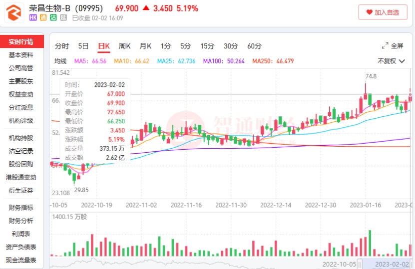 1月30日,荣昌生物公布,经初步测算,公司预计2022年度将由盈转亏,净亏损约9.71亿元。但即便如此,在1月30、31日两个交易日股价收跌后,荣昌生物2月1、2日继续保持股价上攻态势,并在盘中再次站上70港元台阶。