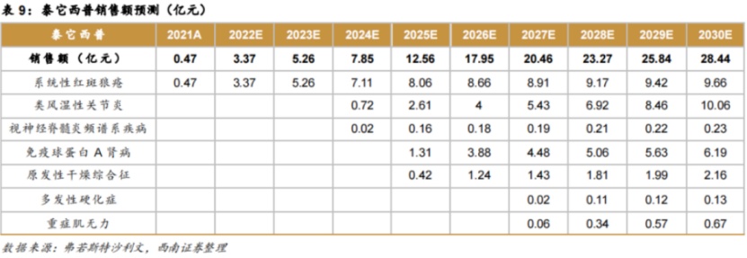 根据弗若斯特沙利文&西南证券研报显示,综合各适应症获批年份、患者人数、年治疗费用等关键假设,预测泰它西普在2027年的销售额有望超过20亿元。