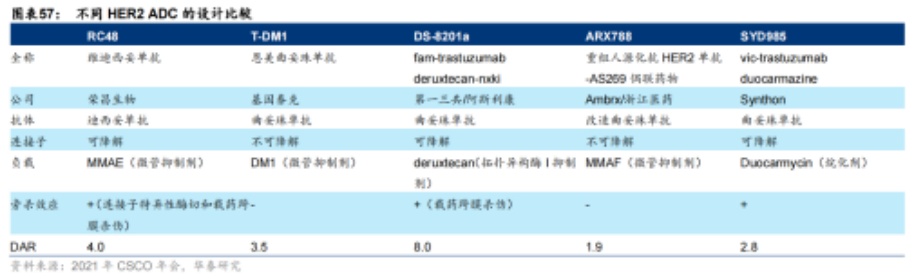 虽然荣昌生物的维迪西妥单抗(RC48)、浙江医药的ARX788、恩美曲妥珠单抗(Kadcyla,T-DM1),都和DS-8201一样属于HER2 ADC,但由于各自的结构设计不一,导致最终的临床疗效出现差异。以抗体偶联比DAR(直接影响ADC药物的疗效和安全性)为例,ARX788、T-DM1、RC48的DAR分别为1.9、3.5、4.0;DS-8201则达到8.0。
