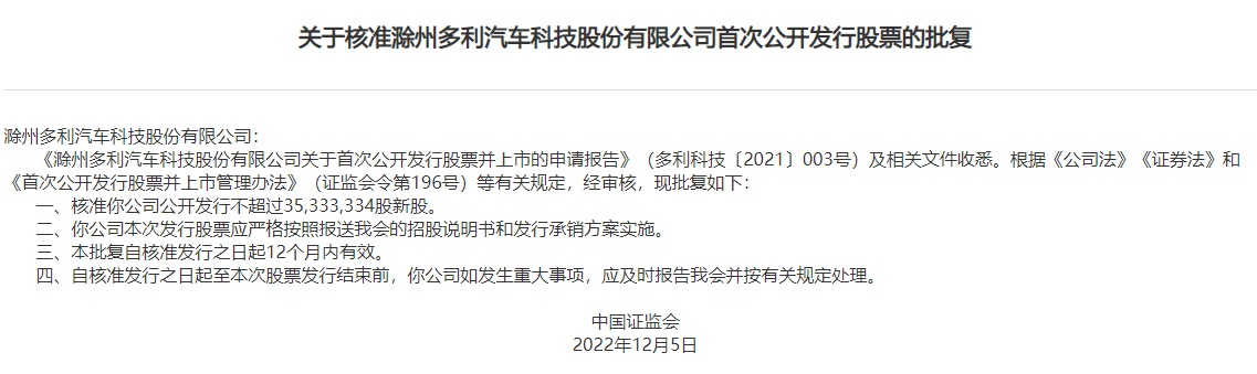 智通财经APP获悉,2月2日,证监会发布核准滁州多利汽车科技股份有限公司(多利科技)首次公开发行股票的批复。证监会表示,核准多利科技公开发行不超过35333334股。