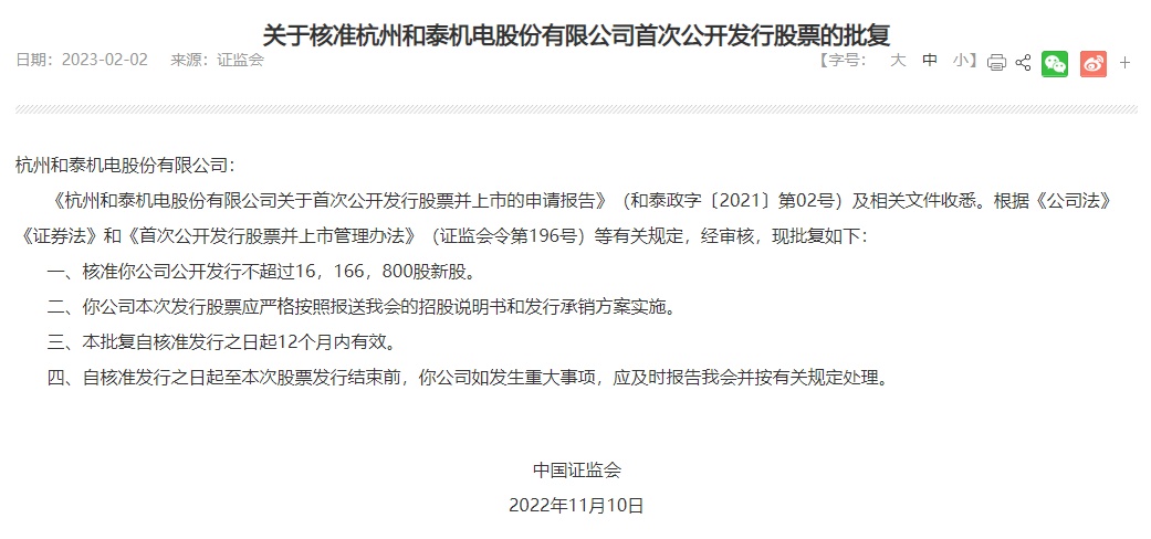 智通财经APP获悉,2月2日,证监会发布核准杭州和泰机电股份有限公司(和泰机电)首次公开发行股票的批复。证监会表示,核准和泰机电公开发行不超过1616.68万股。