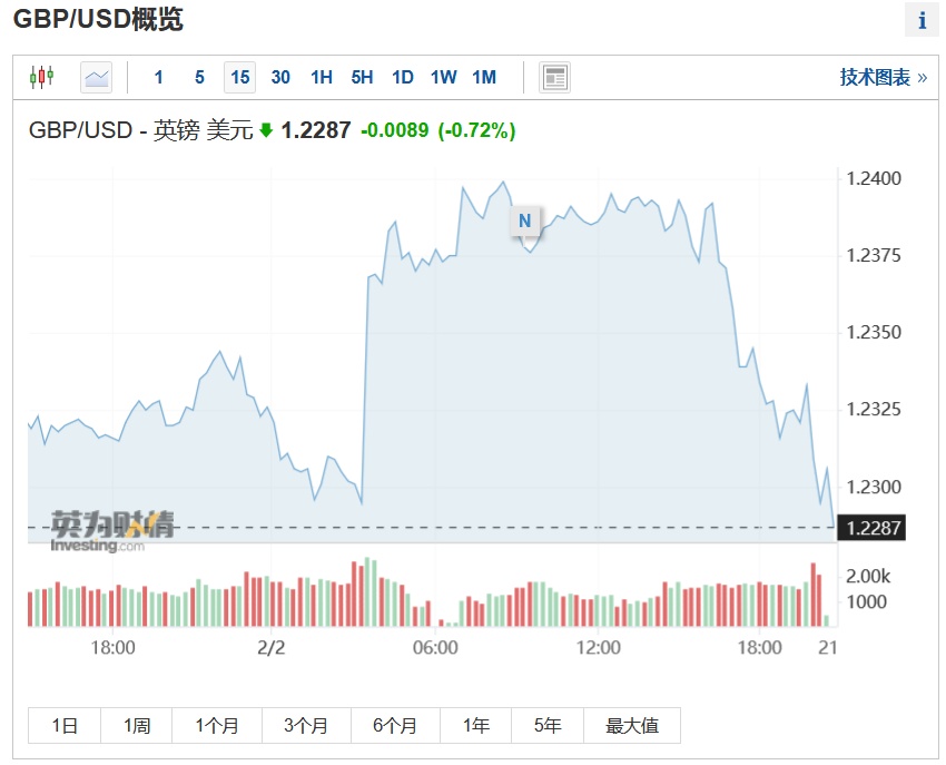 截至发稿,英镑兑美元汇率跌0.72%,报1.2287;该汇率在英国央行公布利率决议后一度涨至1.2360。英国十年期国债收益率跌4.62%,至3.156%。