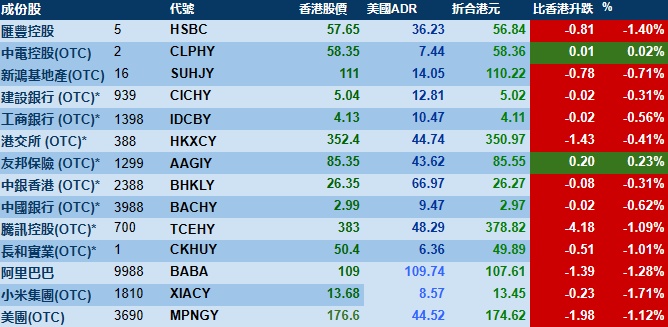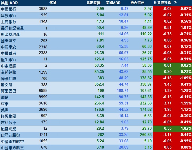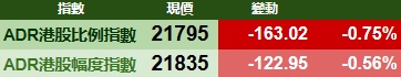 智通财经APP获悉,周四美股三大指数涨跌不一,港股ADR指数下跌,按比例计算,收报21795点,较香港收市跌163.02点或0.75%。