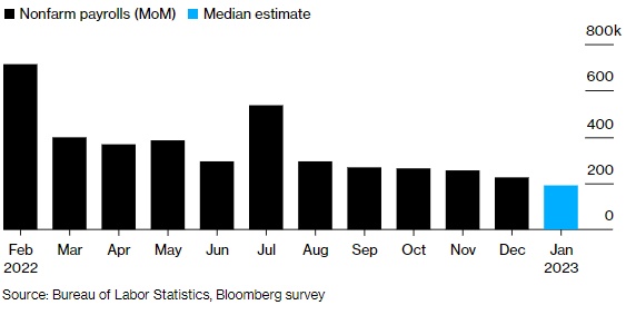 智通财经APP获悉,北京时间2月3日(周五)21:30,美国劳工部将发布1月非农就业报告。经济学家预计,1月非农就业人数增加19万人,这将是自2020年以来的最小增幅;失业率从50年低点小幅上升;平均时薪环比增长0.3%。尽管工资增长仍然稳健,失业率接近历史低点,以及职位空缺高企,美国今年年初招聘人数可能继续放缓,市场预计这将坚定美联储在一段时间内维持高利率的决心。