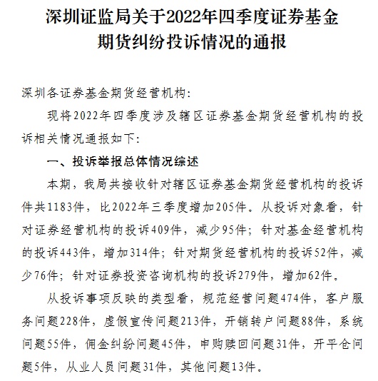 《公告》显示,深圳证监局共接收针对辖区证券基金期货经营机构的投诉件共1183件,比2022年三季度增加205件。从投诉对象看,针对证券经营机构的投诉409件,减少95件;针对基金经营机构的投诉443件,增加314件;针对期货经营机构的投诉52件,减少76件;针对证券投资咨询机构的投诉279件,增加62件。