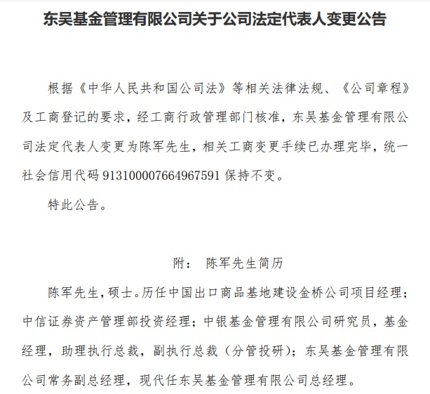 公告显示,陈军历任中国出口商品基地建设金桥公司项目经理;中信证券资产管理部投资经理;中银基金管理有限公司研究员,基金经理,助理执行总裁,副执行总裁(分管投研);东吴基金管理有限公司常务副总经理,现代任东吴基金管理有限公司总经理。