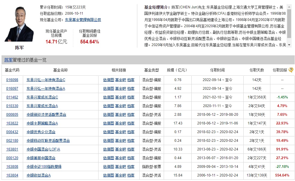 公开资料显示,陈军从业已超15年,从2006年10月开始担任基金经理,历任管理基金数为10只,任职期间最佳基金回报率为554.64%。同花顺iFind数据显示,截至2022年三季度末,东吴基金的基金数量共33只,管理规模为246.13亿元,与二季度末基本持平。