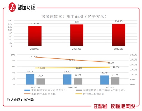 房地产终端需求主要反映住宅及商品房,对其他建筑反映滞后,以整体建筑施工面积看,2022年Q3累计施工面积136.95亿平方米,较前两年分别增长9.96%及1.44%,累计新开工面积呈现走低趋势,占比累计施工面积降至22.2%,而累计竣工面积则持续提升,达到23.74亿平方米,占比提升至17.3%。
