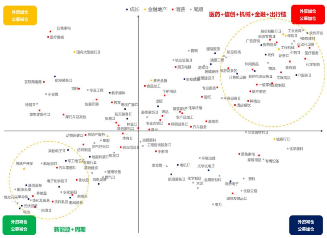 智通财经APP获悉,由元宇证券独家战略支持的中证金牛2022私募大赛于22年12月1日正式启动,赛事正如火如荼开展。不少参赛机构研究团队及产品主理人就市场走势和行业展望发表真知灼见。中海外钜融资产管理集团有限公司指出,成长板块内部切换是内外资的共识。四季度内外资的共识主要在加仓医药、信创、机械、金融和出行链,减仓新能源和周期板块。四季度内外资的分歧主要集中在周期以及部分消费行业。一方面,公募大幅加仓电力、铁路公路、塑料、专用设备、水泥等周期行业,而外资选择流出。另一方面,在外资仓位提升较多的白色家电、医疗器械、互联网电商等行业,公募选择减仓。