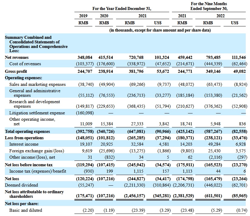 财务数据显示,禾赛科技在2019、2020和2021年度的营收分别为3.48亿元(人民币,下同)、4.16亿元和7.21亿元,期间净亏损分别为1.20亿元、1.07亿元和2.45亿元。该公司在2022年前九个月的营收为7.93亿元,上年同期为4.59亿元;期间净亏损为1.65亿元,上年同期为1.75亿元。