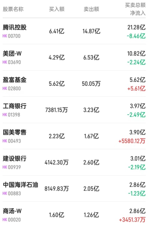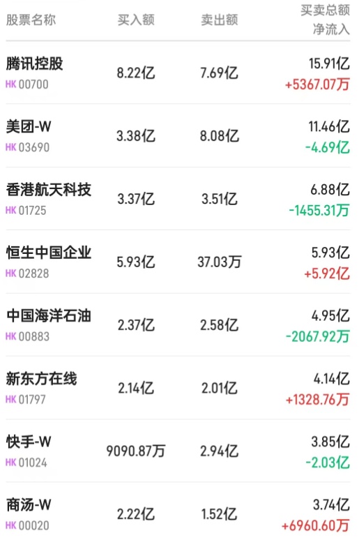 ETF方面,恒生中国企业(02828)、盈富基金(02800)分别获净买入5.92亿、5.61亿港元。此外,碧桂园服务(06098)获净买入2813万港元,而香港航天科技(01725)遭净卖出1455万港元。