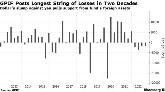 美元一度是GPIF业绩的可靠支撑,但美元兑日元汇率出现了2008年以来的最大季度跌幅,拖累了占该基金投资组合约一半的外国资产的价值。与此同时,在日本央行去年12月突然调整收益率曲线控制政策后,GPIF持有的日债连续第五个季度出现亏损。