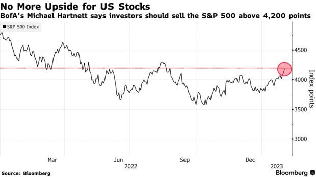 Michael Hartnett建议投资者在标普500指数超过4200点(较周四收盘点位高0.5%)时开始抛售。他预计该指数将在2月14日触及一季度的高点。