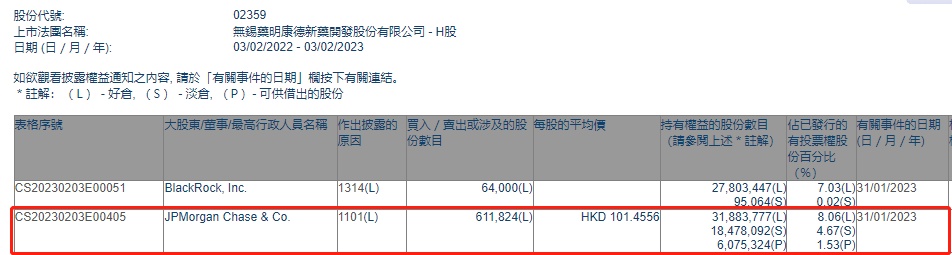 智通财经APP获悉,香港联交所最新资料显示,1月31日,小摩增持药明康德(02359)61.1824万股,每股作价101.4556港元,总金额约为6207.30万港元。增持后最新持股数目约为3188.38万股,最新持股比例为8.06%。