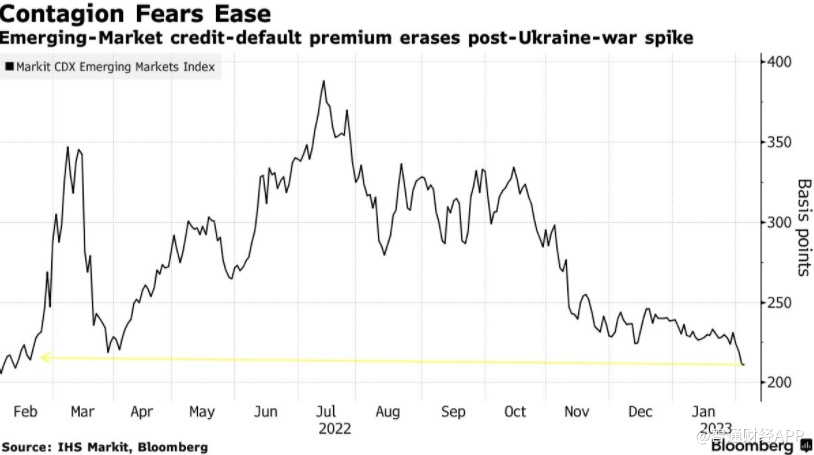 美联储主席鲍威尔本周表示,尽管美联储可能会进一步加息,但反通胀压力已经开始显现,这让投资者感到振奋。IHS Markit的数据显示,对冲巴拿马等18个新兴经济体违约的成本周五降至211个基点,为去年2月俄乌冲突爆发以来的最低水平。