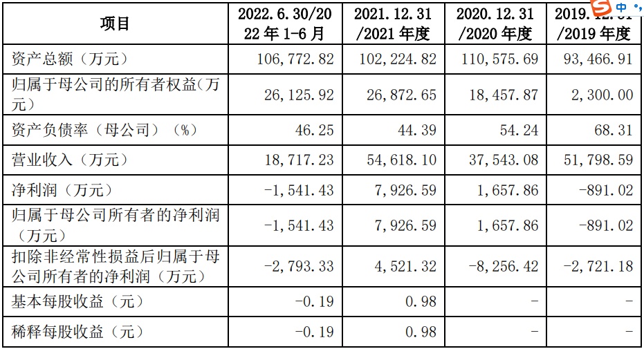 财务方面,于2019年度、2020年度、2021年度及2022年前6个月,公司实现营业收入约5.18亿元、3.75亿元、5.46亿元、1.87亿元;净利润约为-891.02万元、1657.86万元、7926.59万元、-1541.43万元。