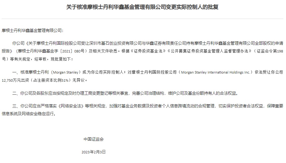 智通财经APP获悉,2月3日,证监会发布关于核准摩根士丹利华鑫基金管理有限公司变更实际控制人的批复:核准摩根士丹利成为公司实际控制人;对摩根士丹利国际控股公司依法受让公司12,750万元出资(占注册资本比例51%)无异议。