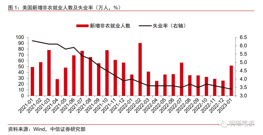 美国劳动力市场表现强劲,大幅超预期,失业率进一步下降。美国1月季调后非农就业人口增加51.7万人,远高于预期的18.9万人,较上月26万人(修正后)大幅上升,为2022年8月以来的最大增幅。失业率从2022年12月3.5%继续下降至3.4%,低于预期的3.6%,失业率为自1969年6月以来的最小值。目前美国失业率处于历史最低位,从就业市场而言美国经济距离衰退仍存在一定距离。