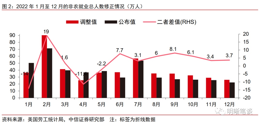 美国劳工统计局基于年度调整惯例以及NAICS行业分类调整大幅修改了去年各月CES调查提供的美国新增非农就业数值,并且基于新规则计算今年1月数据。当前就业统计(CES)调查是针对美国企业和政府机构的大型月度调查,被称为“机构调查”(establishment survey),用于生成美国非农就业人数、非农薪资与工时等数据。1月美国劳工统计局就业报告中表示根据年度惯例,新发布的数据已经过基准化处理,基准化处理是指年度修订处理,将此前基于样本的就业估计数替换为每年(被修订数据所在年份)3月行政数据中的就业人数。行政数据中的就业人数数据主要来自于就业和工资季度普查(QCEW)从各州的失业保险(UI)税收系统中收集就业和工资数据,由于行政统计数据不会受到CES月度估算中固有的抽样或建模误差的影响,这些数据滞后地提供了近乎非农就业总数,因而美国劳工统计局每年进行基准化处理(benchmark process)以提高数据的准确性。在2012-2022年期间,美国年度非农总计就业水平(非季调)的基准调整的平均水平为0.1%(绝对值水平),范围为-0.3%至0.3%,此次2022年度美国非农总计就业水平(非季调)调整变动0.3%,高于平均水平。此外,由于CES数据采用的行业分类依据已从2017年北美产业分类体系(NAICS)修订为NAICS 2022,约10%的就业被重新分类到不同的行业,NAICS修订针对受影响行业的所有历史数据,包括季节性和非季节性调整数据。采用NAICS 2022导致的美国零售贸易和信息部门就业数据存在重大修订、采矿和伐木、制造、批发贸易、金融活动和其他服务部门就业数据存在小幅修订。美国劳工统计局对许多行业名称和描述也进行了更新,以更好地反映官方NAICS名称。