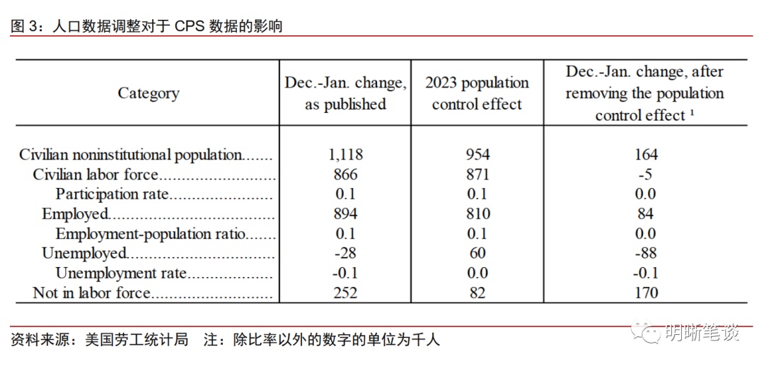 同时,美国劳工统计局对家庭调查中的人口数据也进行了调整,调整一定程度影响了1月劳动参与率等数据但未影响失业率。当前人口调查(CPS)是由人口普查局为劳工统计局进行的每月家庭调查,也被称为“家庭调查”(household