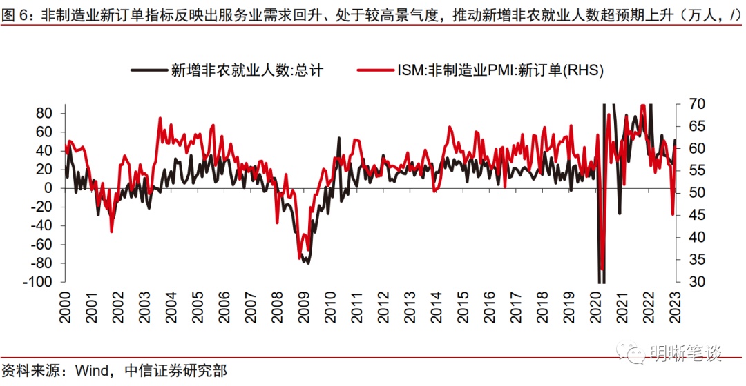 一方面,美国服务业需求回升推动了新增就业人数增长反弹。由于私人部门服务业就业人数为非农就业人数的主要构成,尤其是在2008年后,服务行业就业人数占非农就业总人数总量的80%以上,因而服务业就业成为非农就业的主导因素,二者增长趋势几乎一致。目前消费者习惯逐步由商品转向服务,导致服务消费始终具有较高韧性,并且1月非制造业PMI新订单指数录得60.4的高位水平,近期服务业需求有所回升。近期服务业处于较高景气度是非农就业人数1月强劲超预期增长的主导因素之一。