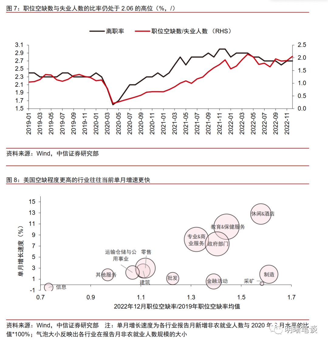 另一方面,美国就业市场紧张程度上升,劳动力供给短缺推动就业增长。当前美国劳动力供给仍十分短缺,劳动参与率录得62.4%,虽然高于预期62.3%和前值62.3%,但1月参与率上升主要由统计数据修订导致的(前文已提及),整体而言,劳动参与率仍在62.1%与62.4%范围内波动,职位空缺数与失业人数比率继续上升至2.06的高位。劳动力市场供不应求推动美国就业强劲增长,职位空缺程度更高的行业,其每月就业人数的增速也会更高。