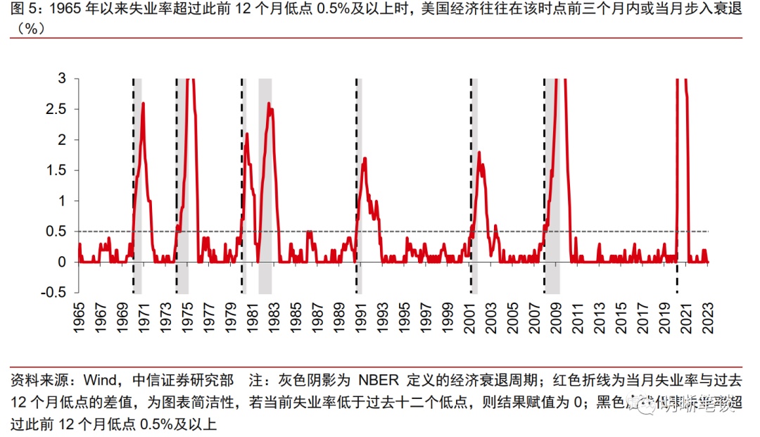当前美国劳动力市场距离衰退仍存在一定距离。美国失业率较此前低点突破0.5%及以上是准确且可较及时地判断美国经济是否已经步入衰退的同步指标,平均而言,该信号仅滞后于美国经济衰退开始时点1个月左右。1月失业率创新低后,当前失业率与此前12个月低点水平的差值为0%,叠加1月新增非农就业人数远高于20万,非农就业对于失业率仍有支撑,整体而言,短期美国经济步入衰退的概率较低。