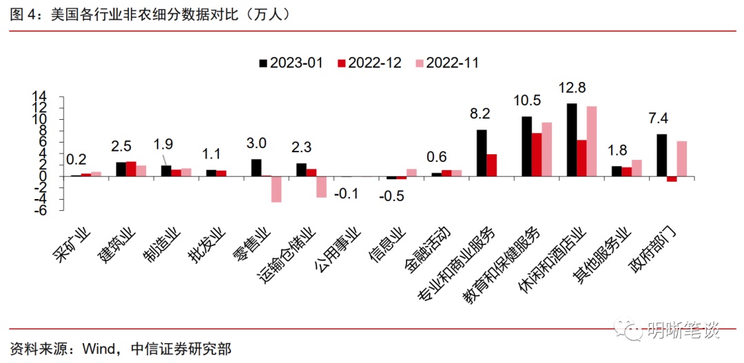细分来看,1月美国非农就业人数的增长主要由休闲和酒店业、教育和保健服务以及专业和商业服务的增长带动。1月美国非农就业人数总计新增51.7万人,高于2022年40.1万人的月度平均增幅。1月非农就业增长具有普遍性,主要由休闲和酒店业(+12.8万人)、教育和保健服务(+10.5万人)、专业和商业服务行业(+8.2万人)的增长推动。并且政府部门的就业人数也有所增加,这一定程度反映了工人从罢工中的返回就业市场。