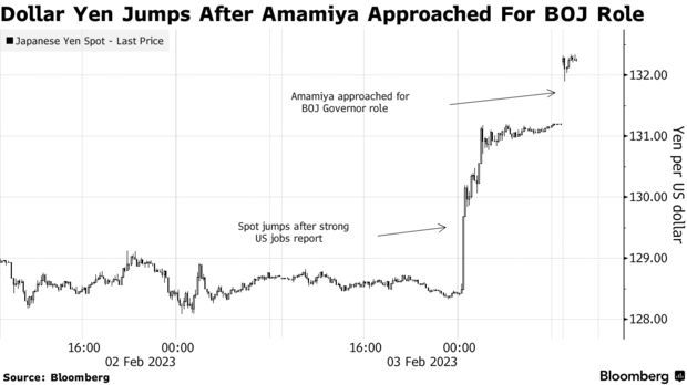 Amamiya),并多次谈及雨宫正佳接替黑田东彦出任下一任央行行长的可能性。由于雨宫正佳被市场认为可能会延续黑田东彦的超宽松政策,截至发稿,美元兑日元汇率涨0.53%至131.87;该汇率日内早些时候一度涨至132.50左右,为1月12日以来最高水平。