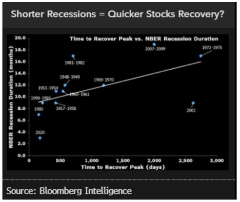 Stovall的观点有一定的道理。对股市来说,即使出现衰退,真正重要的是衰退的时间长短。Bloomberg Intelligence首席股票策略师Gina Martin Adams指出,从历史上看,实际GDP从峰值到谷底的跌幅与股市波动的严重程度并无关联。但更短的衰退带来了更快速的反弹。