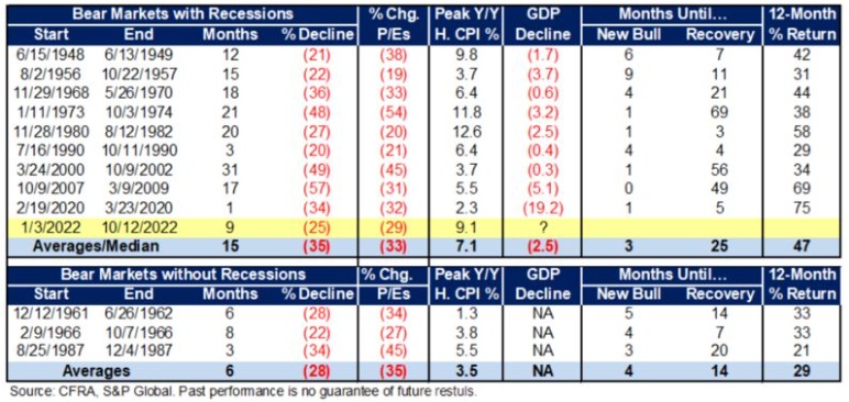历史还表明,经济衰退与否对股市至关重要。CFRA的数据显示,自第二次世界大战以来,有9次熊市伴随衰退,标普500指数平均下跌35%,而没有伴随经济衰退的熊市平均下跌28%。特别有趣的是,自1948年以来,只有三次熊市没有出现衰退。而且每次新的牛市都是在股价触底的五个月内开始的。
