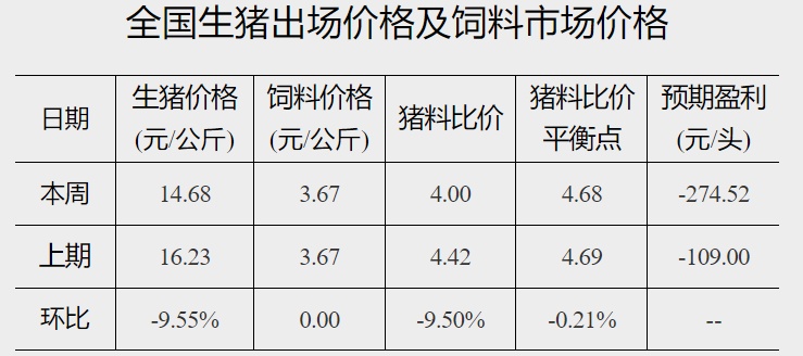 智通财经APP获悉,2月6日,据国家发改委价格监测中心网站消息,截至2023年2月1日当周,全国猪料比价为4.00,较春节前(1月18日)下降9.50%。按目前价格及成本推算,未来生猪养殖头均亏损为274.52元。当周国内猪价以降为主。随着春节假期收尾,终端消费渐显疲软,屠宰企业开工率低位调整,整体收购难度不大,压价情绪较浓,而养殖端虽有抗价情绪,但生猪出栏压力仍存,周内猪价小幅走低。2月第2周生猪供应量或继续增加,而消费处于传统淡季,预计猪价或小幅下跌。