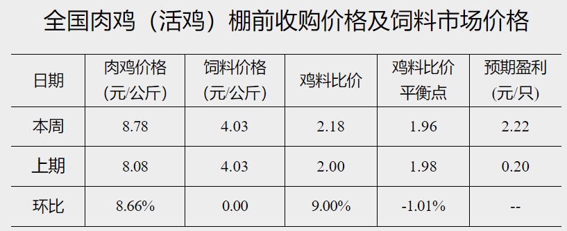 截至2023年2月1日当周,全国鸡料比价为2.18,较春节前(1月18日)上涨9.00%。按目前价格及成本推算,未来肉鸡养殖预期盈利为2.22元/只。本周屠宰企业陆续开工,收购量小幅增加,且周内毛鸡出栏量较少,走货速度加快,鸡价持续上涨。下周肉鸡出栏量仍旧不多,屠宰企业开工继续恢复,毛鸡走货较为顺畅,预计下周鸡价或继续小涨。