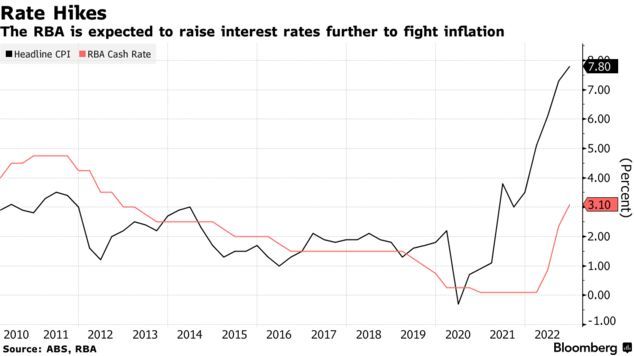 市场预计澳洲联储将在周二加息25个基点至3.35%。该行表示,将采取“必要措施”把通胀带回2%-3%的目标。投资者押注,随着通胀开始放缓,全球央行的紧缩周期即将结束。上周美联储放缓了加息幅度,仅上调25个基点。