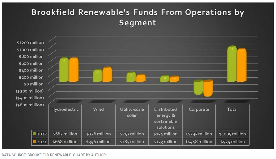 受益于多元化业务,Brookfield Renewable在去年的营运现金流(FFO)略高于10亿美元,合每股1.56美元,较2021年高出约8%。太阳能业务是该公司增长的主要推动力,来自公用事业规模太阳能资产的FFO在去年增长了近37%,这主要得益于收购、新建成的太阳能设施以及西班牙较高的电价。此外,来自分布式太阳能和可持续解决方案的FFO增长了近16%,原因是该业务组合的增长和更高的电价。