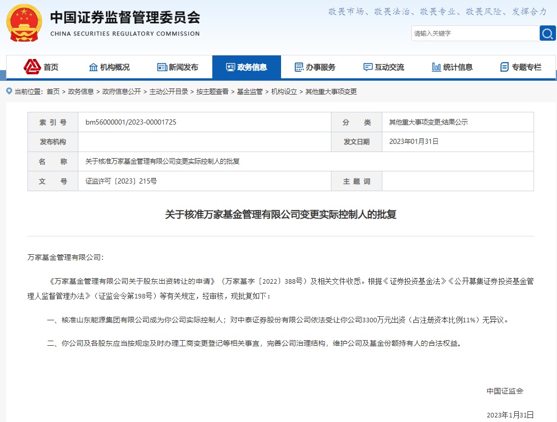 智通财经APP获悉,1月31日,证监会发布关于核准万家基金管理有限公司变更实际控制人的批复,核准山东能源集团有限公司成为万家基金实际控制人,对中泰证券(600918.SH)依法受让万家基金3300万元出资(占注册资本比例11%)无异议。