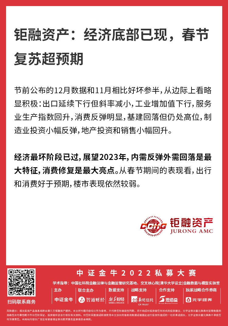 从春节期间的表现看,钜融资产认为,出行和消费好于预期,楼市表现依然较弱。具体看,出行方面,虽然春运发送旅客人次不及2019年,但百度地图显示迁徙规模已经超过疫前。观影消费表现强劲,截止大年初六春节总票房破65亿,仅次于2021年的78亿。境内游市场恢复至疫情前7-8成水平,出境游市场快速增长。地产销售仍然不佳,虽然返乡正常化,但置业不见回暖,2023年春节期间地产销售处于过去5年同期最低水平。