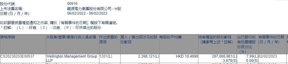 智通财经APP获悉,香港联交所最新资料显示,2月2日,Wellington Management Group LLP减持龙源电力(00916)239.8121万股,每股作价10.469港元,总金额约为2510.59万港元。减持后最新持股数目约为2.67亿股,最新持股比例为7.99%。