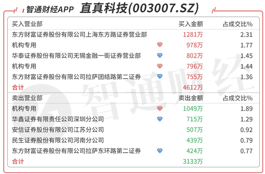 直真科技(003007.SZ):多主力现身龙虎榜,2家机构席位对倒净买入725万元,买三是知名游资苏南帮的席位买入802万元,当日净买入1582万元,该股今日放量突破箱体,有望冲击前期高点。